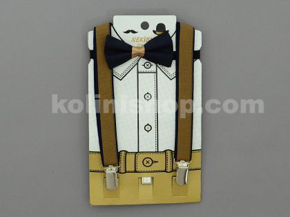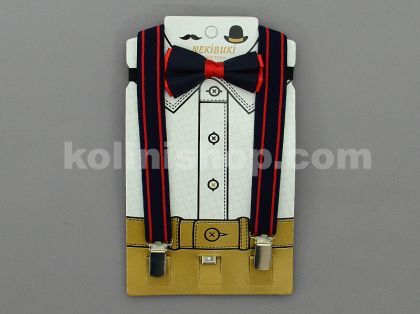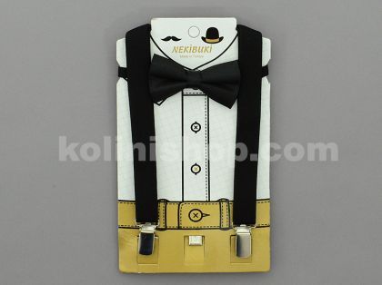 Комплект от папийонка и тиранти за възраст от 1 до 7г. Регулиране дължината на тирантите. Папийонката е на ластик. Комплектът се предлага в три цвята- кафяв /снимка 1/, черно-червен /сн.2/ и черен /сн.3/.