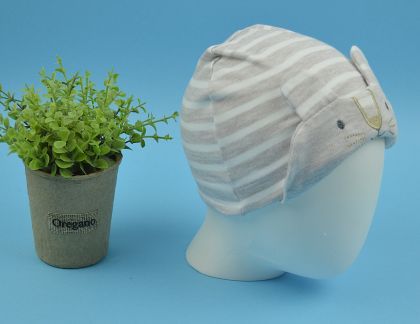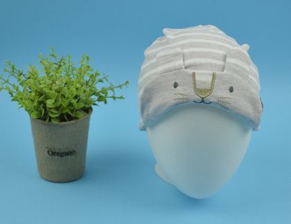 Бежаво/бяло райе шапка с бродерия на зайче с декоративни ушички.