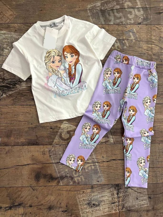 Комплект от бяла тениска с апликация на Елза и Анна и лилав 7/8-ми клин с апликации.
