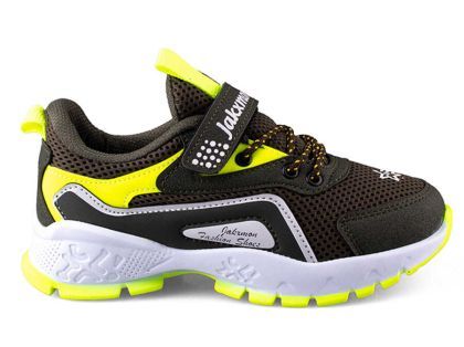 Сиви маратонки с горна плетена част и ленти от изкуствена кожа. Завръзват се с връзки и една лепенка в горната част. Бяло/зелен електрик подметка.